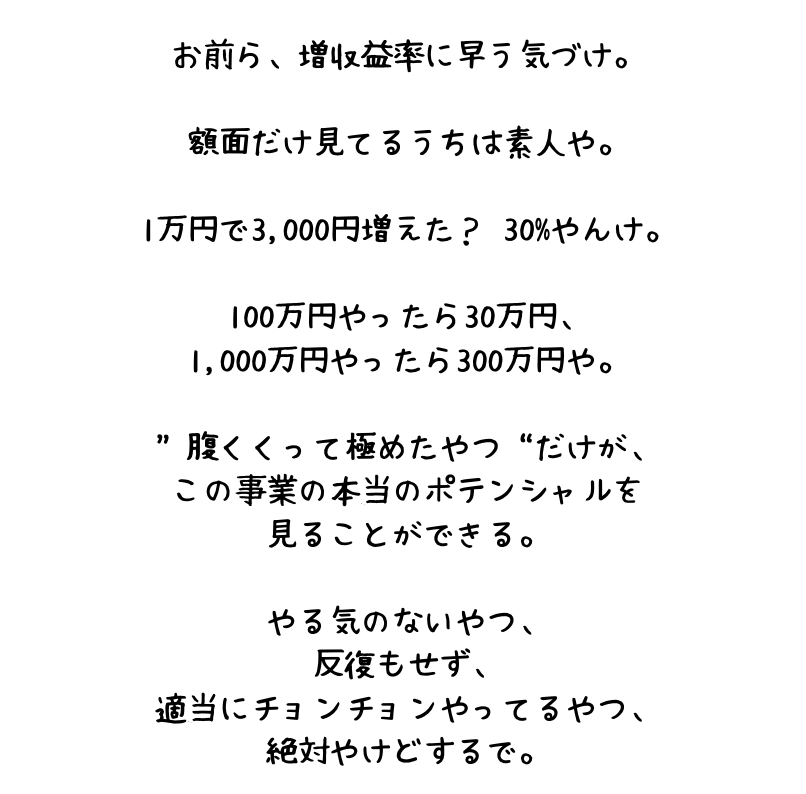 ちゃうちゃう、軍資金1万円でやってたら増収益率30%や。